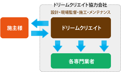 多くのゼネコンやハウスメーカーが、工事監理を下請業者が担当するというなか、ドリームクリエイトは自社建設部スタッフを中心に全ての工事を直轄体制で運営しています。設計の意図を汲んだ工事の正確さや、品質へのこだわりはもちろんのこと、そこに携わる職人一人ひとりが ドリームクリエイトの家造りの仲間としての誇りをもって、施主様の思いを一つひとつ受け止め、ご満足いただける家造りに取り組んでいます。
